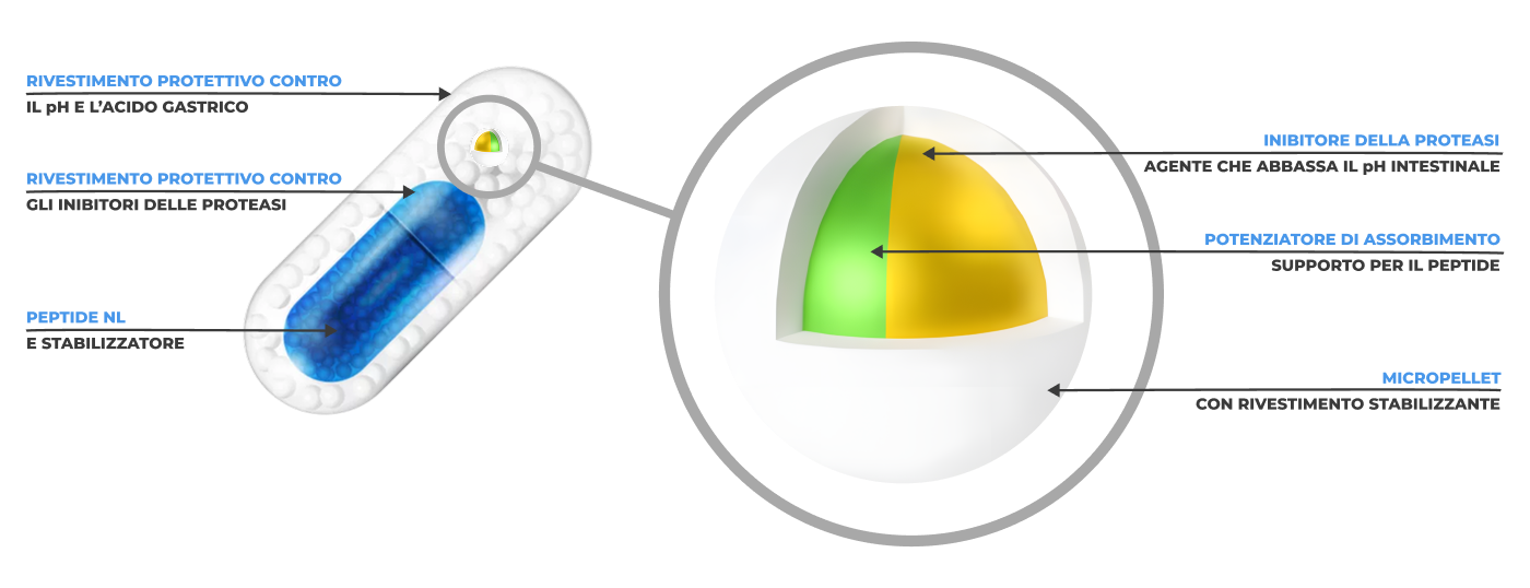 Tecnologia brevettata a doppia capsula – per una consegna efficace del peptide all'organismo. NL-PEPTIDES-DELIVERY™ è il nostro sistema brevettato di trasporto orale di peptidi.