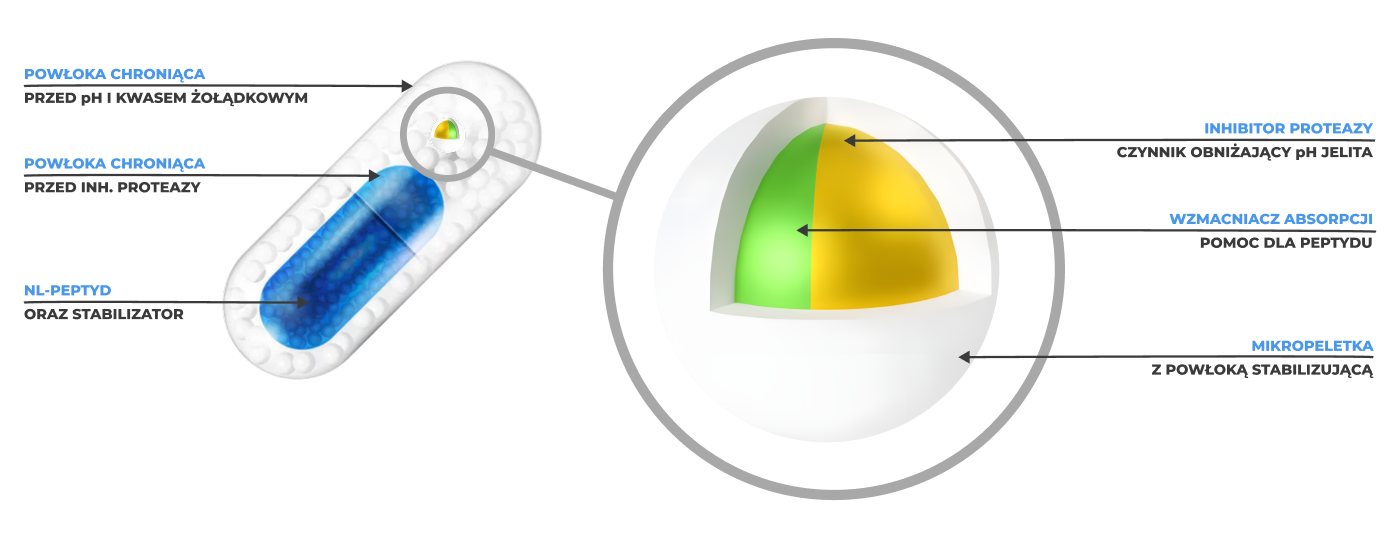 Został opracowany po to, by rozwiązać dwa największe problemy peptydów: degradację w żołądku i słabą biodostępność w jelicie. Zewnętrzna kapsułka jest pokryta specjalną powłoką kwasoodporną, dzięki czemu omija żołądek i dociera nienaruszona do jelita cienkiego.